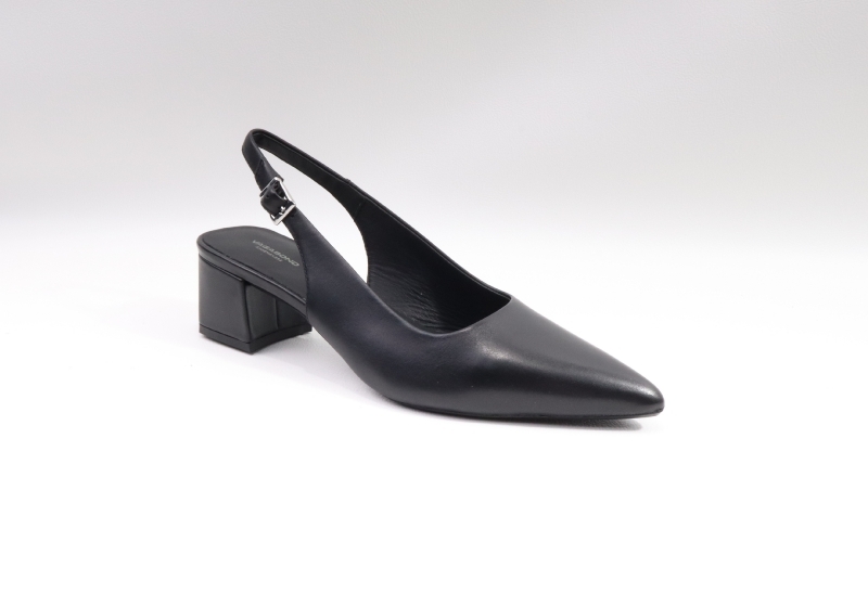 Marta är en tidlös slingback med elegant profil. Modellen är gjord i svart skinn med lätt spetsig tåform och justerbar ankelrem med silverfärgat spänne. Blockklackarna mäter 50 mm.