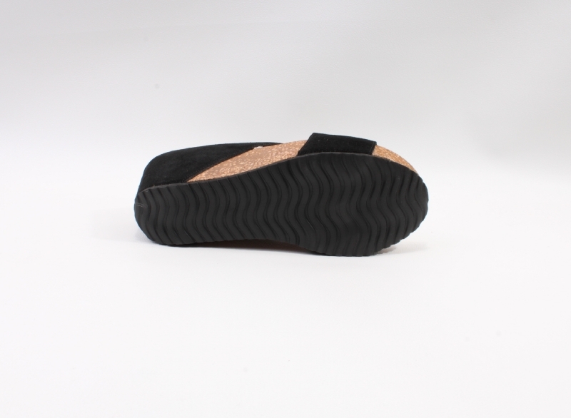 Slip in sandal Frances från Copenhagen Shoes tillverkade i mocka med kilklack. Korslagda breda band som går ner på sulkanten. Innersula i mocka med sömlös logga i häl. Kilklack med ett lager korkblandning.