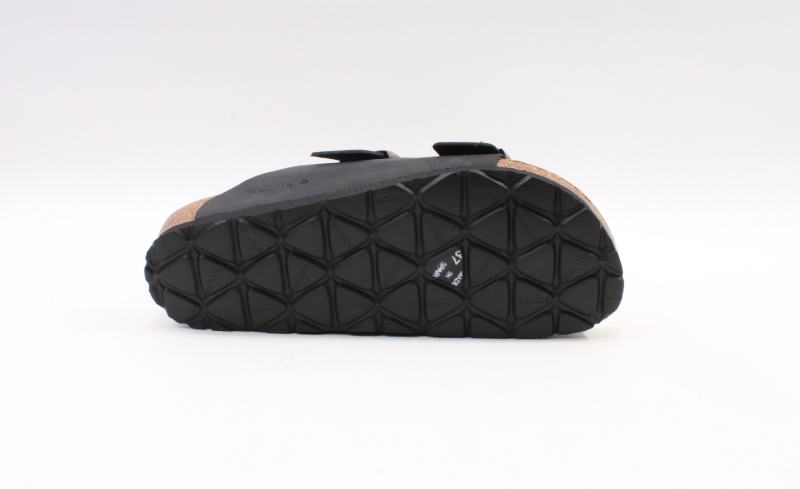 Klassisk slip in biosandal från Rohde tillverkad i skinn. Två justerbara remmar med spännen i metall för att kunna anpassa passformen. Mjuk innersula i mocka med sömlös logga och en mellansula i kork.