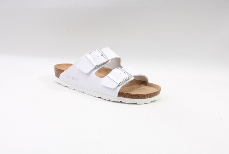 Klassiska slip in biosandaler från Rohde tillverkad i syntet. Två justerbara remmar med spännen i silver för att kunna anpassa passformen. Vit foder i textil och beige mjuk innersula i mocka med sömlös logga. Mellansula i kork med vit yttersula i syntet.