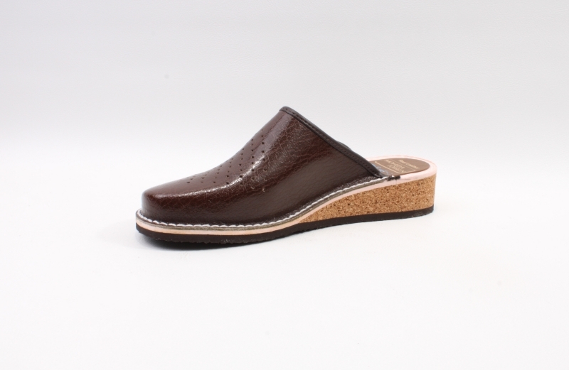 Klassisk slip-in toffel från Moheda. Ovandel i perforerat mönster och äkta läder med en sula i kork och texon som innersula. Yttersula i gummi. Passar lika bra på kontoret som i sommarstugan.