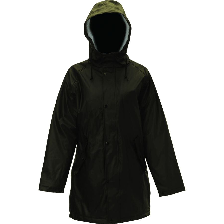 Denna gröna regnjacka för dam har ett varmt och gott foder invändigt för att klara kyligare dagar. Knäpps med både dragkedja och knappar och har två fickor med knappknäppning.